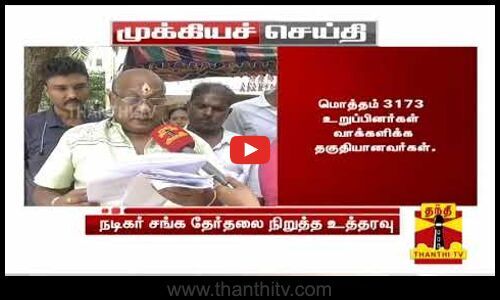 நடிகர் சங்க தேர்தலை நிறுத்தி வைக்குமாறு சங்கங்களின் பதிவாளர் உத்தரவிட்டுள்ளார்.