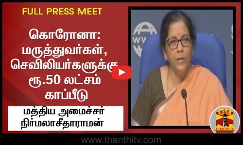 டெல்லியில் செய்தியாளர்களிடம் பேசிய மத்திய நிதியமைச்சர் நிர்மலா சீதாராமன், கொரோனாவுக்கு எதிராக போராடி வரும் மருத்துவர் - செவிலியர்களுக்கு, 50 லட்சம் ரூபாய் காப்பீடு செய்யப்படும் என தெரிவித்தார்.