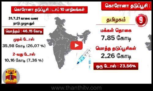 நாடு முழுவதும், ஜூலை 31 காலை வரை 46.15 கோடி தடுப்பூசிகள் அளிக்கப்பட்டுள்ளன. 35 கோடியே 98 லட்சம் பேருக்கு முதல் டோஸும், 10 கோடியே 16 லட்சம் பேருக்கு இரண்டு டோஸ் தடுப்பூசியும் அளிக்கப்பட்டுள்ளது. மக்கள் தொகை அடிப்படையில் ஒரு டோஸ் தடுப்பூசி செலுத்தப்பட்டவர்கள் விகிதம் 26.07 சதவீதமாக உள்ளது. இரண்டு டோஸ் தடுப்பூசி செலுத்தப்பட்டவர்கள் விகிதம் 7.36 சதவீதமாக உள்ளது. 24 கோடி மக்கள் தொகை கொண்ட உத்தர பிரதேசத்தில் 4 கோடியே 76 லட்சம் தடுப்பூசிகள் போடப்பட்டுள்ளன.12 கோடியே 43 லட்சம் மக்கள் தொகை கொண்ட மகாராஷ்டிராவில் இதுவரை 4 கோடியே 37 லட்சம் தடுப்பூசிகள் செலுத்தப்பட்டுள்ளன. 6 கோடியே 43 லட்சம் மக்கள் தொகை கொண்ட குஜராத்தில், இதுவரை 3 கோடியே 29 லட்சம் தடுப்பூசிகள் செலுத்தப்பட்டுள்ளன. 8 கோடியே 25 லட்சம் மக்கள் தொகை கொண்ட ராஜஸ்தானில் இதுவரை 3 கோடியே 20 லட்சம் தடுப்பூசிகள் போடப்பட்டுள்ளன. 8 புள்ளி 7 கோடி மக்கள் தொகை கொண்ட மத்திய பிரதேசத்தில், இதுவரை 3 கோடியே 09 லட்சம் தடுப்பூசிகள் செலுத்தப்பட்டுள்ளன. 6 கோடியே 83 லட்சம் மக்கள் தொகை கொண்ட கர்நாடகாவில், இதுவரை 3 கோடி தடுப்பூசிகள் போடப்பட்டுள்ளன. 10 கோடி மக்கள் தொகை கொண்ட மேற்கு வங்கத்தில், இதுவரை 2 கோடியே 91 லட்சம் தடுப்பூசிகள் செலுத்தப்பட்டுள்ளன.12 புள்ளி 7 கோடி மக்கள் தொகை கொண்ட பீகாரில், இதுவரை 2 கோடியே 39 லட்சம் தடுப்பூசிகள் செலுத்தப்பட்டுள்ளன. 7 கோடியே 85 லட்சம் மக்கள் தொகை கொண்ட தமிழகத்தில், இதுவரை 2 கோடியே 26 லட்சம் தடுப்பூசிகள் போடப்பட்டுள்ளன. 5 கோடியே 44 லட்சம் மக்கள் தொகை கொண்ட ஆந்திராவில், இதுவரை 2 கோடியே 14 லட்சம் தடுப்பூசிகள் போடப்பட்டுள்ளன.