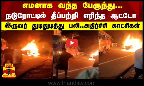 எமனாக வந்த பேருந்து...நடுரோட்டில் தீப்பற்றி எரிந்த ஆட்டோ இருவர் துடிதுடித்து பலி ..