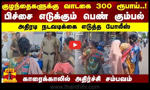 காரைக்கால் டவுன் பகுதிகளில், 50க்கும் மேற்பட்ட பெண்கள், கை குழந்தைகளுடன் பொதுமக்களை தொந்தரவு செய்து யாசகம் எடுத்து வருவதாக போலீசாருக்கு புகார்கள் சென்றன. இதன் அடிப்படையில், போலீசார் ரோந்து பணியில் ஈடுபட்டு, குழந்தைகளுடன் யாசகம் எடுத்த 20க்கும் மேற்பட்ட பெண்களை காவல்நிலையம் அழைத்துச் சென்று விசாரணை நடத்தினர். அதில், செம்மரான் கோயில் பகுதியில் இருந்து ஒரு குழுவாக வந்து காரைக்காலில் பிச்சை எடுப்பது தெரியவந்தது. குழந்தைகளுக்கு ஒரு நாளைக்கு 300 ரூபாய் கொடுத்து வாடகைக்கு எடுத்து யாசகம் எடுப்பதாக புகார் எழுந்த நிலையில், அந்த குழந்தைகள் கடத்தப்பட்ட குழந்தைகளா? அல்லது வாடகைக்கு எடுக்கப்பட்டதா? என்பது குறித்து போலீசார் விசாரணை நடத்தி வருகின்றனர்.
