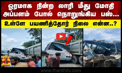 ஓரமாக நின்ற லாரி மீது மோதி அப்பளம் போல் நொறுங்கிய பஸ்... உள்ளே பயணித்தோர் நிலை என்ன..?