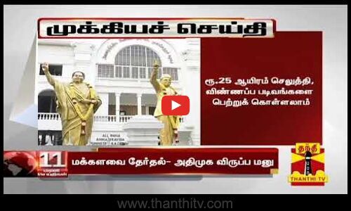 காலை 10 மணி முதல் 5 மணி வரை விண்ணப்பத்தை பூர்த்தி செய்து வழங்கலாம் என்றும் தெரிவிக்கப்பட்டுள்ளது. தேர்தல் தேதி அறிவிப்புக்கு முன்பே அ.தி.மு.க. , அதற்கான பணிகளை தொடங்கியுள்ளது அரசியல் வட்டாரத்தில் முக்கியத்துவம் வாய்ந்ததாக கருதப்படுகிறது.