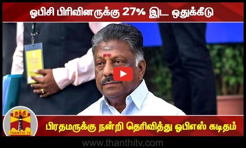 மருத்துவ படிப்புகளில் இதர பிற்படுத்தப்பட்ட மாணவர்களுக்கு 27 சதவீத இடஒதுக்கீடு வழங்கப்பட்டதற்கு நன்றி தெரிவித்து, பிரதமர் மோடிக்கு அதிமுக ஒருங்கிணைப்பாளர் ஓ.பன்னீர்செல்வம் கடிதம் எழுதியுள்ளார். அதில் 27 சதவீத இடஒதுக்கீட்டு முறையை நடப்பாண்டு முதலே நடைமுறையில் கொண்டு வருவது வரவேற்கத்தக்கது என்றும், இதன் மூலம் ஆண்டுதோறும் ஆயிரக்கணக்கான மாணவர்கள் பயன்பெறுவர் என்றும் ஓபிஎஸ் தெரிவித்துள்ளார். இந்த இடஒதுக்கீடு நடவடிக்கையானது பிற்படுத்தப்பட்ட பிரிவினர் மீதான தங்களின் அக்கறையை காட்டுவதாகவும் கடிதத்தில் ஓபிஎஸ் குறிப்பிட்டுள்ளார்.