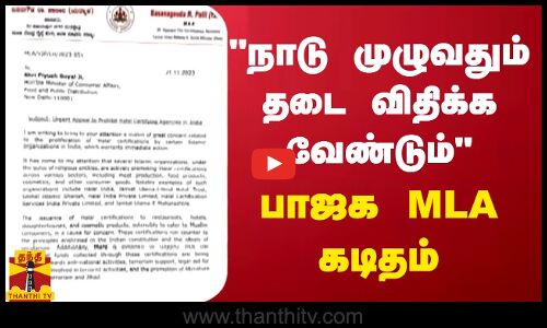நாடு முழுவதும் உணவு, மருந்து, அழகு சாதன பொருட்கள் மீதான ஹலால் சான்றிதழுக்கு தடை விதிக்க வேண்டும் என்று கர்நாடக பாஜக எம்எல்ஏ பாசன கவுடா பாடீல் யத்னால், மத்திய அமைச்சர் பியூஷ் கோயலுக்கு கடிதம் எழுதியுள்ளார். அக்கடிதத்தில் பல இஸ்லாமிய அமைப்புகள், மத நிறுவனங்கள் என்ற அடையாளத்தின் கீழ், இறைச்சி உற்பத்தி, உணவு பொருள்கள், அழகுசாதனம் மற்றும் பிற நுகர்வு பொருள்கள் மீது ஹலால் சான்றிதழ் வாங்குவதை ஊக்குவித்து வருகின்றன என்றும், உணவகங்கள், தங்கும் விடுதிகள் மற்றும் அழகு சாதன பொருள்களுக்கு ஹலால் சான்றிதழ் வழங்கப்படுவது கவலை அளிப்பதாகவும் தெரிவித்துள்ளார்... முன்னதாக பாஜக ஆளும் உத்தரப் பிரதேச மாநில அரசு கடந்த சனிக்கிழமை அம்மாநிலத்தில் ஹலால் தரச் சான்று பெற்ற பொருட்கள் விற்பனை செய்ய தடை விதித்திருந்தது குறிப்பிடத்தக்கது.