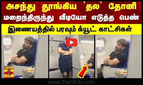 விமானத்தில் சி.எஸ்.கே கேப்டன் தோனி அயர்ந்து தூங்கிக் கொண்டிருந்ததை வீடியோவாக எடுத்து, ஃபேன்-கேர்ள் (fan girl) ஆக மாறியுள்ளார் விமான பணிப்பெண் ஒருவர்.... இது தொடர்பான க்யூட்டான காட்சிகள் இணையத்தில் வைரலாகி வருகின்றன.