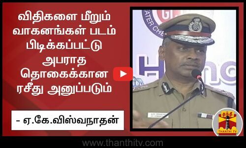 தமிழகத்திலேயே முதல் முறையாக போக்குவரத்து விதிகளை மீறுபவர்களை கண்டறிந்து அபராதம் விதிக்கும் அதிநவீன கேமராக்களின் இயக்கங்களை சென்னை மாநகர காவல் ஆணையர் ஏ.கே.விஸ்வநாதன் தொடங்கிவைத்தார். பின்னர் செய்தியாளர்களை சந்தித்த அவர், சென்னை அண்ணா நகரில் உள்ள முக்கிய சந்திப்பில் போக்குவரத்து விதிகளை மீறும் வாகனங்களின் நம்பர் பிளேட்டுகள் படம் பிடிக்கப்பட்டு, வாகனத்தின் உரிமையாளுக்கு அபராத தொகைக்கான ரசீது அனுப்படும் என்று கூறினார்.