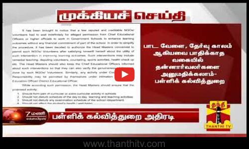 அரசுப் பள்ளிகளில் மாணவர்களின் கற்றல் திறனை மேம்படுத்தும் பணிகளில் தன்னார்வ தொண்டு நிறுவனங்களை அனுமதிக்கலாம் என பள்ளிக்கல்வித்துறை அதிரடிவ அறிவிப்பை வெளியிட்டுள்ளது. இது தொடர்பாக இயக்குனர் கண்ணப்பன் வெளியிட்டுள்ள செய்திக்குறிப்பில், பாட வேளை மற்றும் தேர்வு காலம் ஆகியவை பாதிக்காத வகையில் தன்னார்வலர்களை அனுமதிக்கலாம் என்று குறிப்பிடப்பட்டுள்ளது.