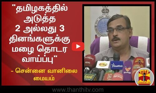 தமிழகத்தில் அடுத்த இரண்டு, மூன்று நாட்களுக்கு மழை நீடிக்கும் என வானிலை ஆய்வு மையம் தெரிவித்துள்ளது. சென்னை நுங்கம்பாக்கத்தில் செய்தியாளர்களை சந்தித்த வானிலை ஆய்வு மையத்தின் தென்மண்டல தலைவர் பாலச்சந்திரன், இதனை தெரிவித்தார். தமிழகத்தில் 14 மாவட்டங்களில் கனமழைக்கான வாய்ப்பு இருப்பதாகவும், அப்போது அவர் குறிப்பிட்டார்.