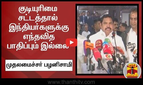 குடியுரிமை சட்டத்தினால் இந்தியர்களுக்கு எந்த பாதிப்பும் இல்லை என்றும் எதிர்க்கட்சிகள் போராட்டத்தை தூண்டுவதாகவும் முதலமைச்சர் எடப்பாடி பழனிசாமி குற்றம்சாட்டியுள்ளார். டெல்லியில் செய்தியாளர்களிடம் பேசிய அவர், இலங்கை அகதிகளுக்கு இரட்டை குடியுரிமை வழங்க பிரதமரிடம் வலியுறுத்தப்படும் என கூறினார்.