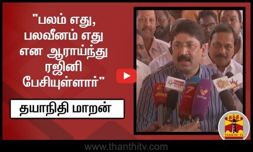 நடிகர் ரஜினிகாந்த் அவரது பலம் எது, பலவீனம் எது என்று ஆராய்ந்து பேசியிருப்பதாக திமுக எம்பி தயாநிதி மாறன் தெரிவித்துள்ளார். சென்னை யானைகவுனியில் திமுக இளைஞரணி சார்பில் நடைபெற்ற கிரிக்கெட் போட்டியை தொடங்கி வைத்த தயாநிதி மாறன், பல்வேறு நலத்திட்ட உதவிகளையும் வழங்கினார். நிகழ்ச்சிக்கு பின் செய்தியாளர்களை சந்தித்த அவர், வரலை என்று சொன்னவரை விட்டு விடுங்கள் என்றும், திரும்ப திரும்ப தொந்தரவு படுத்த வேண்டாம் என்றும் கூறியதோடு, ரஜினி எங்கே இருந்தாலும் அவருக்கு வாழ்த்துக்கள் என்றும் தயாநிதி மாறன் கூறினார்.