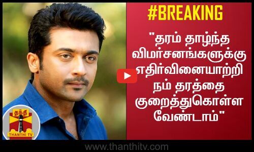 "தரம் தாழ்ந்த விமர்சனங்களுக்கு எதிர் வினையாற்றி நம் தரத்தை குறைத்து கொள்ள வேண்டாம்" என்று ரசிகர்களுக்கு நடிகர் சூர்யா வேண்டுகோள் விடுத்துள்ளார்.