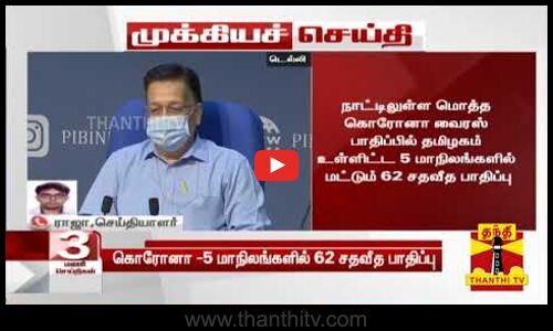 நாட்டிலுள்ள மொத்த கொரோனா வைரஸ் பாதிப்பில் தமிழகம் உள்ளிட்ட 5 மாநிலங்களில் மட்டும் 62 சதவீத பாதிப்பு உள்ளதாக, மத்திய சுகாதார அமைச்சகம் அறிவித்துள்ளது. டெல்லியில் செய்தியாளர்களை சந்தித்த மத்திய சுகாதார அமைச்சகத்தின் செயலாளர் ராஜேஷ் பூஷன், மகாராஷ்டிரா, ஆந்திரப் பிரதேசம், கர்நாடகா, உத்தரபிரதேசம் மற்றும் தமிழ்நாடு ஆகிய மாநிலங்களில் கொரோனா வைரஸ் பாதிப்பு அதிகம் இருப்பதாக தெரிவித்தார். மேலும், கொரோனா உயிரிழப்பு அதிகம் இருக்கக்கூடிய மாநிலங்களில் 70% ஆந்திரா, டெல்லி, கர்நாடகா, தமிழ்நாடு மற்றும் மகாராஷ்டிராவில் உள்ளதாக தெரிவித்தார்.