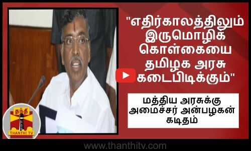 இருமொழிக் கொள்கையில் தமிழக அரசு உறுதியாக உள்ளதாக, மத்திய கல்வி அமைச்சருக்கு, தமிழக உயர்கல்வி அமைச்சர் அன்பழகன் கடிதம் எழுதியுள்ளார். அந்தக் கடிதத்தில் தேசிய கல்விக்கொள்கையில் உள்ள அம்சங்கள் குறித்து, விளக்கியுள்ளார். மும்மொழிக்கொள்கை விவகாரத்திற்கு எதிர்ப்பு தெரிவித்துள்ள அவர், தமிழகத்தில் இதுவரை அமலில் உள்ள இருமொழிக்கொள்கையே தொடர்ந்து அமலில் இருக்கும் என்றும், எதிர்காலத்திலும் இருமொழி கொள்கையையே தமிழக அரசு கடைபிடிக்கும் என்றும் குறிப்பிட்டுள்ளார். கலை, அறிவியல் படிப்புகளுக்கும் நுழைவுத் தேர்வு என்பது, கிராமப்புற மாணவர்களுக்கு சுமையை ஏற்படுத்தும் என்றும் அன்பழகன் தெரிவித்துள்ளார்.