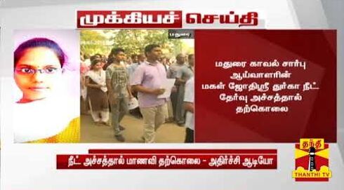 இந்நிலையில், மதுரை ரிசர்வ் லைன் பகுதியை சேர்ந்த ஜோதி ஸ்ரீ துர்கா என்ற மாணவி, நீட் தேர்வுக்காக படித்து வந்தார். 19 வயதான மாணவியின் தந்தை முருகசுந்தரம் காவல் சார்பு ஆய்வாளராக உள்ளார். 6வது சிறப்பு பட்டாலியன் குடியிருப்பில் வசித்து வருகின்றனர். இந்நிலையில் தேர்வு அச்சம் காரணமாக ஜோதி ஸ்ரீ துர்கா இன்று அதிகாலை வீட்டில் தூக்கு போட்டு தற்கொலை செய்து கொண்டார். இச்சம்பவம் குறித்து ரிசர்வ் லைன் போலீசார் விசாரணை நடத்தி வருகின்றனர். நீட் தேர்வால் தொடரும் தற்கொலை சம்பவங்கள் பெற்றோர் மத்தியில் அச்சத்தை ஏற்படுத்தி உள்ளது. இதனிடையே தற்கொலை செய்து கொள்வதற்கு முன், மாணவி ஜோதிஸ்ரீ பேசிய உருக்கமான ஆடியோ தற்போது வெளியாகியுள்ளது.