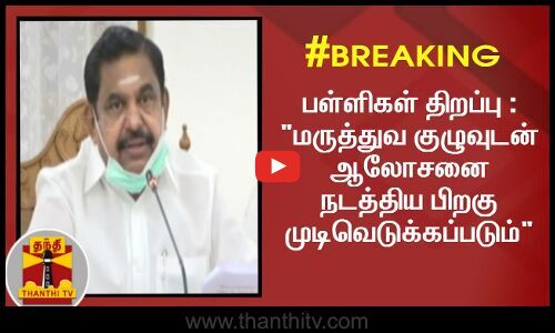தமிழகத்தில் அக்டோபர் ஒன்று முதல் மேல்நிலைப்பள்ளிகள் திறப்பது குறித்து, இன்று மாலை முடிவெடுக்கப்படும் என முதலமைச்சர் பழனிசாமி அறிவித்துள்ளார். சென்னை தலைமைச் செயலகத்தில் ஆட்சியர்களுடன் ஆலோசனை நடத்திய பிறகு பேசிய அவர், இன்று மாலை மருத்துவ நிபுணர்கள் குழுவினருடன் ஆலோசனை நடத்திய பிறகு, முடிவு அறிவிக்கப்படும் என்றார்.