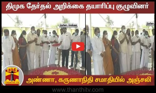 திமுக தேர்தல் அறிக்கை தயாரிப்பு குழுவினர் சென்னை மெரினாவில் உள்ள அண்ணா, கருணாநிதி நினைவிடத்தில் அஞ்சலி செலுத்தினர்.