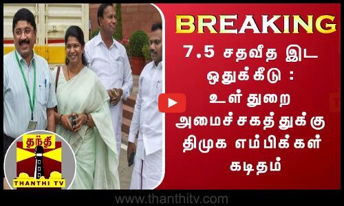 மருத்துவ கல்வியில் 7 புள்ளி ஐந்து சதவீத உள்ஒதுக்கீடு மசோதாவுக்கு ஒப்புதல் தர தமிழக ஆளுநருக்கு அழுத்தம் கொடுக்க வேண்டும் என தி.மு.க எம்.பிக்கள் வலியுறுத்தியுள்ளனர். இது தொடர்பாக மத்திய உள்துறை அமைச்சர் அமித்ஷாவுக்கு தி.மு.க எம்.பிக்கள் கடிதம் ஒன்றை எழுதியுள்ளனர். ஏழை எளிய மாணவர்களின் மருத்துவ கனவை நனவாக்கும், தமிழக அரசின் இந்த மசோதாவுக்கு விரைவில் ஒப்புதல் வழங்க நடவடிக்கை மேற்கொள்ள வேண்டும் என அவர்கள் வலியுறுத்தியுள்ளனர்.