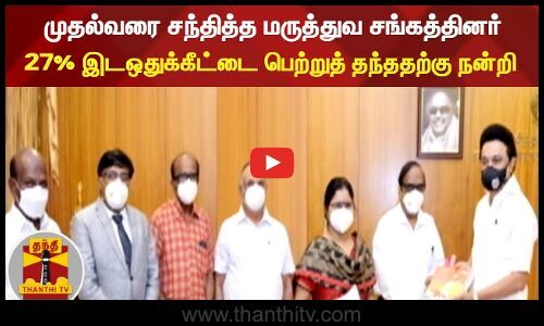அகில இந்திய மருத்துவ படிப்பில் இதர பிற்படுத்தப்பட்டோர் பிரிவினருக்கு 27 சதவீத இடஒதுக்கீட்டை பெற்றுத் தந்ததற்காக, முதலமைச்சர் மு.க.ஸ்டாலினை, பல்வேறு மருத்துவ சங்கத்தினர் சந்தித்து நன்றி தெரிவித்தனர். சென்னையில் தலைமைச்செயலகத்தில் ஸ்டாலினை சந்தித்த அவர்கள், 27 சதவீத இடஒதுக்கீட்டை பெற்றுத் தந்ததன் மூலம், சமூகநீதி நிலைநாட்டப்பட்டுள்ளதாக கூறினர்.