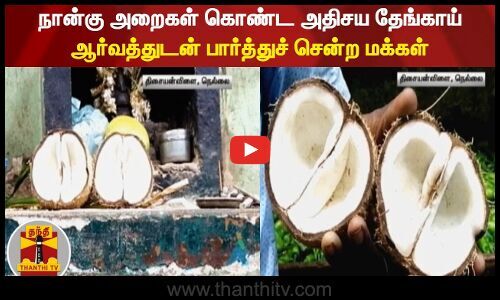 நெல்லை மாவட்டம் திசையன்விளையில் உடைக்கப்பட்ட தேங்காய், நான்கு அறைகளாக பிரிந்து காணப்பட்டதை, அப்பகுதி மக்கள் ஆச்சர்யத்துடன் பார்த்து சென்றனர்.