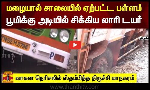மழையால் சாலையில் ஏற்பட்ட பள்ளம்... பூமிக்கு அடியில் சிக்கிய லாரி டயர்