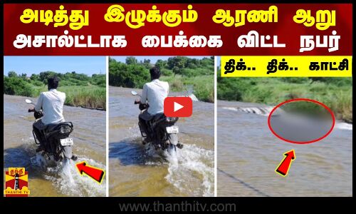 அடித்து இழுக்கும் ஆரணி ஆறு... அசால்ட்டாக பைக்கை விட்ட நபர்... திக் திக் காட்சி