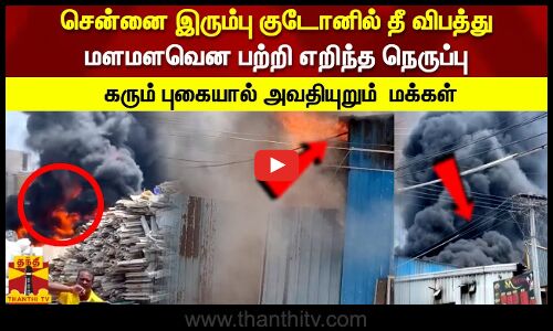 சென்னை இரும்பு குடோனில் தீ விபத்து மளமளவென பற்றி எறிந்த நெருப்பு கரும் புகையால் அவதியுறும் மக்கள்