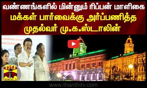 சிங்கார சென்னை 2.0 திட்டத்தின் கீழ், வண்ண விளக்குகளால் ஒளிரூட்டப்பட்ட சென்னை மாநகராட்சி ரிப்பன் கட்டிடத்தை, முதலமைச்சர் ஸ்டாலின் மக்கள் பார்வைக்கு அர்ப்பணித்தார். அந்த நேரடி காட்சிகளை தற்போது காணலாம்..