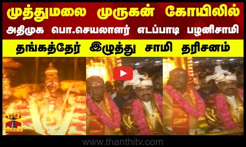 சேலம் முத்துமலை முருகன் கோயிலில், அதிமுக பொதுச்செயலாளர் எடப்பாடி பழனிசாமி தங்கத்தேர் இழுத்து சாமி தரிசனம் செய்தார். புத்திரகவுண்டன்பாளையத்தில் உள்ள 146 அடி உயர முருகன் சிலை உள்ள கோயிலுக்கு எடப்பாடி பழனிசாமி சென்றார். வேல் பகுதிக்கு சென்ற அவர், அங்கு பால் அபிஷேகம் செய்து சாமி தரிசனம் செய்தார். பின்னர் தங்கத்தேர் இழுக்கும் நிகழ்வில் கலந்துகொண்டு கோயிலை சுற்றி தேரை இழுத்தார்.