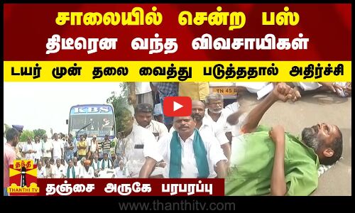 சாலையில் சென்ற பஸ் - திடீரென வந்த விவசாயிகள் - டயர் முன் தலை வைத்து படுத்ததால் அதிர்ச்சி