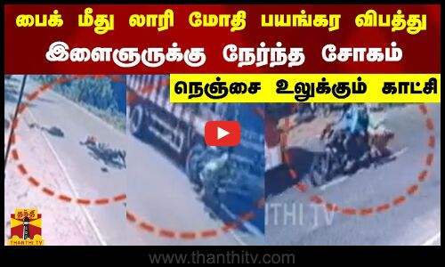 பைக் மீது லாரி மோதி பயங்கர விபத்து - இளைஞருக்கு நேர்ந்த சோகம்..நெஞ்சை உலுக்கும் காட்சி