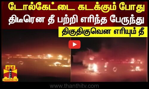 டோல்கேட்டை கடக்கும் போது திடீரென தீ பற்றி எரிந்த பேருந்து.. திகுதிகுவென எரியும் தீ