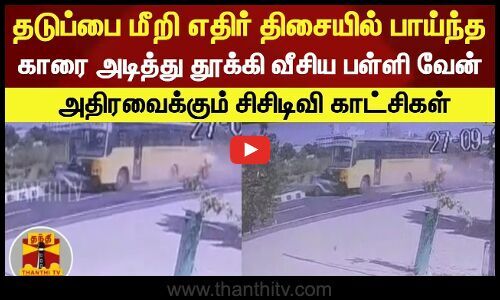 தடுப்பை மீறி எதிர் திசையில் பாய்ந்த காரை அடித்து தூக்கி வீசிய பள்ளி வேன் - அதிரவைக்கும் சிசிடிவி காட்சிகள்