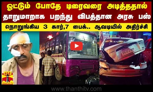ஓட்டும் போதே டிரைவரை அடித்ததால் தாறுமாறாக பறந்து விபத்தான அரசு பஸ்.. நொறுங்கிய 3 கார், 7 பைக்