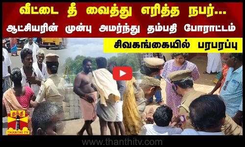 வீட்டை தீ வைத்து எரித்த நபர்... ஆட்சியரின் முன்பு அமர்ந்து தம்பதி போராட்டம்.. சிவகங்கையில் பரபரப்பு