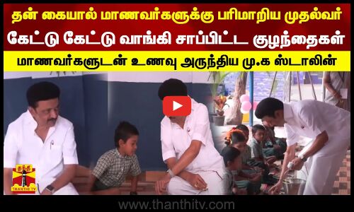 தன் கையால் மாணவர்களுக்கு பரிமாறிய முதல்வர்.. கேட்டு கேட்டு வாங்கி சாப்பிட்ட குழந்தைகள்.. மாணவர்களோடு உணவு அருந்திய முதல்வர் மு.க ஸ்டாலின்