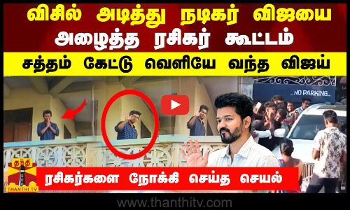 ரசிகர்களை நோக்கி கை அசைத்த விஜய் விசில் அடித்து நடிகர் விஜயை அழைத்த ரசிகர் கூட்டம் சத்தம் கேட்டு வெளியே வந்த விஜய் !