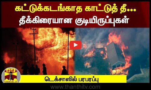 அமெரிக்காவின் டெக்சாஸ் மாகாணத்தில் கட்டுக்கடங்காத காட்டுத் தீ பரவலால் குடியிருப்புகள் தீக்கிரையாகின. பால்ச் ஸ்பிரிங் நகரில் ஏற்பட்ட காட்டுத் தீ, அருகிலுள்ள குடியிருப்புகளுக்கும் பரவியது. இதனால் குடியிருப்புகள் பற்றி எரிந்து முற்றிலும் சேதம் அடைந்தன. குடியிருப்புகள் கொழுந்துவிட்டு எரியும் காட்சிகள் வெளியாகியுள்ள நிலையில், காட்டுத் தீயைக் கட்டுப்படுத்தும் பணிகள் அங்கு தீவிரப்படுத்தப்பட்டு உள்ளன.