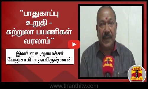 இலங்கைக்கு, சுற்றுலா பயணிகள் அச்சமின்றி வரலாம் என அந்நாட்டு அமைச்சர் வேலுசாமி ராதாகிருஷ்ணன் கூறியுள்ளார். தந்தி டிவிக்கு அவர் அளித்த சிறப்புப் பேட்டியில், சட்டம் ஒழுங்கு கட்டுக்குள் கொண்டுவரப்பட்டு, பாதுகாப்பு உறுதி செய்யப்பட்டுள்ளதாக அவர் கூறினார்.