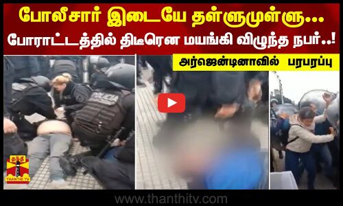 போலீசார் இடையே தள்ளுமுள்ளு... போராட்டத்தில் திடீரென மயங்கி விழுந்த நபர்..! அர்ஜென்டினாவில் பரபரப்பு