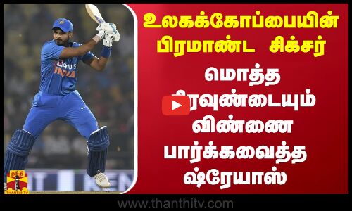 உலகக்கோப்பையின் பிரமாண்ட சிக்சர் மொத்த கிரவுண்டையும் விண்ணை பார்க்கவைத்த ஷ்ரேயாஸ் ஐயர்