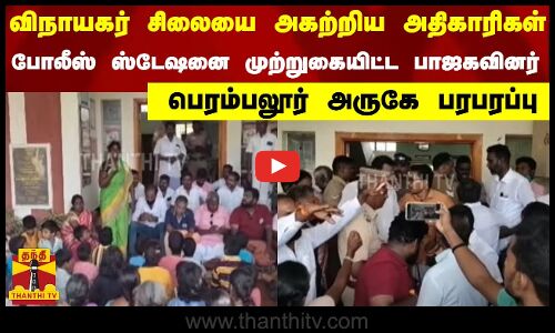 விநாயகர் சிலை அகற்றம்- பாஜக எதிர்ப்பு /களத்தூர், பெரம்பலூர்/பெரம்பலூர் அருகே வி களத்தூர் கிராமத்தில் விநாயகர் சிலை அகற்றம்/வருவாய்த்துறையினரை கண்டித்து பாஜகவினர், பொதுமுக்கள் முற்றுகை போராட்டம்/காவல்நிலையத்தை முற்றுகையிட்டு வாசலில் அமர்ந்து போராட்டத்தில் ஈடுபட்டுள்ள மக்கள் /அனுமதியின்றி வைக்கப்பட்டதாக கூறி விநாயகர் சிலையை அகற்றிய வருவாய்த்துறை