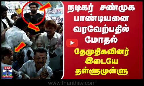 நடிகர் சண்முக பாண்டியனை வரவேற்பதில் மோதல்.. தேமுதிகவினர் இடையே தள்ளுமுள்ளு