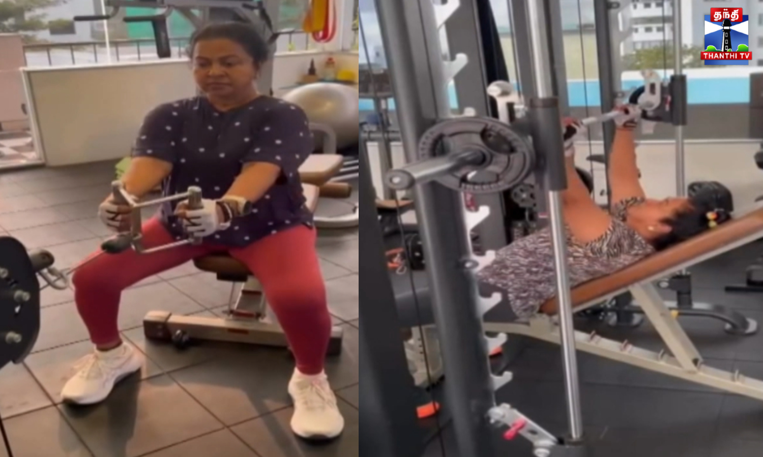 நடிகை ராதிகா சரத்குமார் ஜிம்மில் தீவிர உடற்பயிற்சி மேற்கொள்ளும் வீடியோ ஒன்றை சமூக வலைதளத்தில் பகிர்ந்துள்ளார்