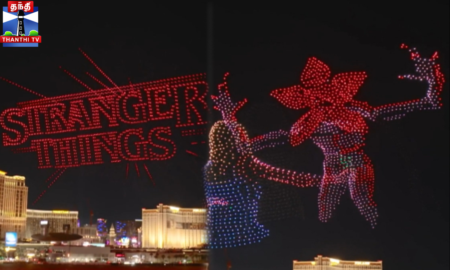 ஸ்ட்ரேஞ்சர் திங்ஸ் சீரிசோட ரசிகர்கள குஷிப்படுத்துற மாதிரி அமெரிக்காவோட லாஸ் வேகாஸ்ல ஒரு பிரமாண்டமான ட்ரோன் ஷோ நடத்தப்பட்டுருக்கு..
