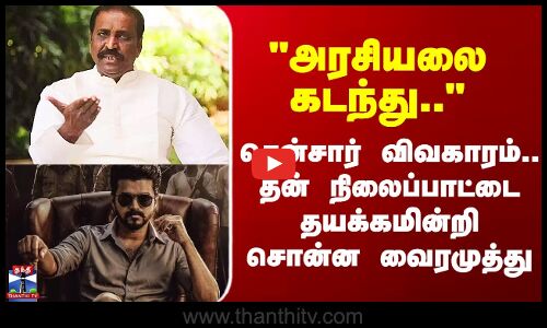 தணிக்கை குழு கலை, கலாச்சாரம் விழுமியங்களை பார்க்க வேண்டுமே தவிர, அரசியலை கலையில் பார்க்கக்கூடாது என்றும், அரசியலை கடந்து சமூகத்தின் கலையாக திரைப்படம் கருதப்பட வேண்டுமெனவும், கவிஞர் வைரமுத்து தெரிவித்தார்.