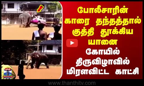 கேரள மாநிலம் திருச்சூரில் கோயில் விழாவின் போது மிரண்டு ஓடிய யானை போலீசாரின் காரை தந்ததால் குத்தி தூக்கிய பரபரப்பு காட்சி வெளியாகி உள்ளது.