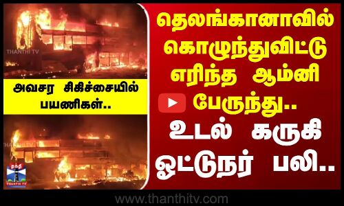 தெலங்கானாவில் கண்டெய்னர் லாரி மீது மோதி தனியார் ஆம்னி பேருந்து தீ பற்றி எரிந்த விபத்தில் 3 பேர் உயிரிழந்த சம்பவம் சோகத்தை ஏற்படுத்தியுள்ளது... பேருந்து முழுவதும் கொழுந்துவிட்டு எரியும் பரபரப்பு காட்சிகளை பார்க்கலாம்..