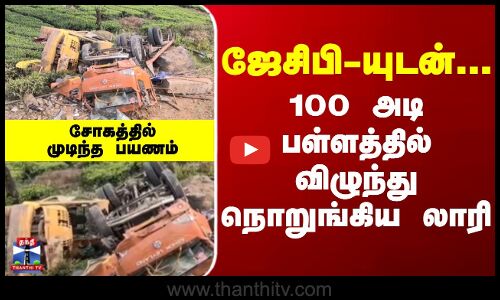 தமிழ்நாட்டில் இருந்து கேரளாவிற்கு, பொக்லைன் இயந்திரத்தை ஏற்றிச் சென்ற லாரி ஒன்று, வளைவில் திரும்பும் போது தலைகுப்புற கவிழ்ந்த விபத்தில், ஓட்டுநர் உயிரிழந்தார். இடுக்கி மாவட்டம் சின்னக்கானல் அருகே இந்த துயரம் நிகழ்ந்துள்ளது. 100 அடி பள்ளத்தில் கவிழ்ந்ததில் லாரி முற்றிலும் நொறுங்கியது. படுகாயமடைந்த 5 பேர், தேனி மருத்துவக் கல்லூரி மருத்துவமனையில் அனுமதிக்கப்பட்டுள்ளனர்.