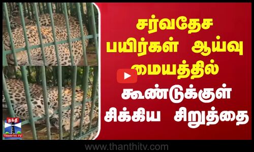 ஹைதராபாத் புறநகர் பகுதியில் உள்ள சர்வதேச பயிர்கள் ஆய்வு மையத்தில் சிறுத்தை ஒன்று கூண்டில் சிக்கியது. இந்த பகுதியில் கடந்த சில மாதங்களாக இரண்டு சிறுத்தைகள் சுற்றி திரிந்த நிலையில், வனத்துறையினர் சிறுத்தைகளை பிடிப்பதற்காக கூண்டு வைத்திருந்தனர். கூண்டில் சிக்கிக்கொண்ட சிறுத்தையை வனத்துறையினர் நேரு உயிரியல் பூங்காவிற்கு கொண்டு சென்றனர்.